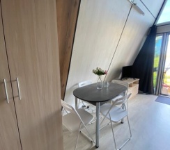 Номер на первом этаже, с собственным выходом на террасу с видом на лес и озеро, состоит из одной комнаты и кухни- студии.