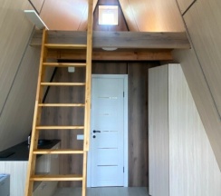 На первом этаже вы найдете кухонный уголок, гостиную с просторным диваном, где можно не только покушать свои любимые блюда, но и проводить время в компании. Санузел обеспечен всем необходимым для удобства и комфорта.