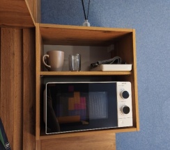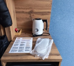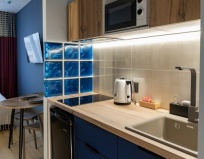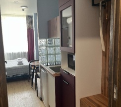 Вы не пожалеете, выбрав этот отель для отдыха в Казани. Здесь все продуманно для гостей и компактно размещено: большая кровать, телевизор с вай-фаем, кондиционер, микроволновка, плитка для готовки с вы тяжкой и подсветкой (вся минимальная посуда, сковорода, кастрюля) , небольшой холодильник, душ с разными кнопочка и режимами и с жидким мыломдля рук, для тела и для волос, унитаз с довотчиками крышки и стульчака, стиралка, зеркало с подсветкой, фен, отпариватель, лампа регулируется и имеет вид облаков, есть одноразовые зубная щетка и паста, есть умная сушилка с режимами и таймером,но много вещей вы высушить. Заселение бесконтактное, вся информация приходит в вотсап, двери с кодами, то есть в номер никто не сможет войти, есть камеры хранения но не сильно вместительные. В коридоре есть кулер, на ресепшине соль, сахар и комплект щетки с пастой. В отеле есть лифт.