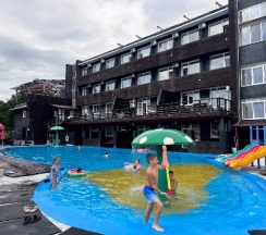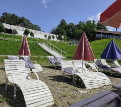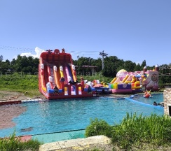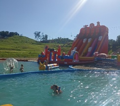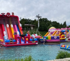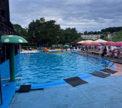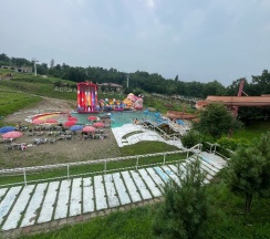 А нам очень понравилось! Верхний бассейн большой хороший, одно из немногих мест, где можно хорошо поплескаться детям и взрослым поплавать. Много детских площадок на территории, фонтан работает, качели для взрослых, всё зелено. Так вот, возле большого бассейна кафе неплохое и бар (только с пивом и покупными напитками). Можно самим арендовать беседку и готовить на мангале. Много шезлонгов, зонтов. Рядом с бассейном туалет, душ и раздевалка. Горки для взрослых 😍 От верхнего в нижний бассейн ведёт длинная горка. В нижнем бассейне водные развлечения бесплатно (банан, батут и ещё одна штука 😁). Огромный детский батут с водой и горками ещё возле второго бассейна. Ребёнок накупался, накатался, наигрался, вобщем, доволен и счастлив! Мы хорошо отдохнули тоже. Конечно, идеальных мест не бывает. Конкретно здесь из минусов: 1. Очень скользкие полы, дети на них летают каждые 2 минуты. Моя тоже коленку разбила сильно, аптечка на входе в аквапарк. Что-то нужно, конечно же, придумать и настелить по всей территории, либо ходить в прорезиненных акватапках; 2. Вопрос, убираются ли когда-нибудь туалеты 😢 А так всё супер!!!