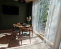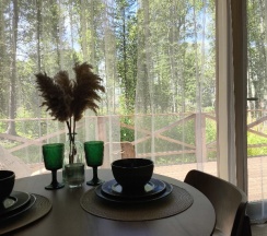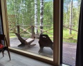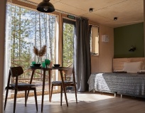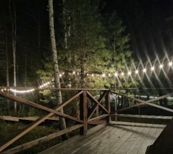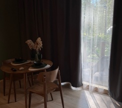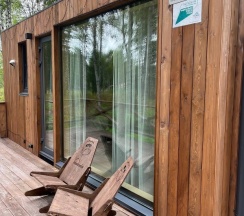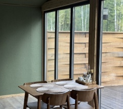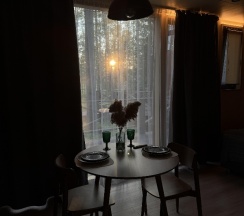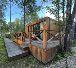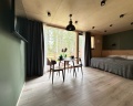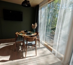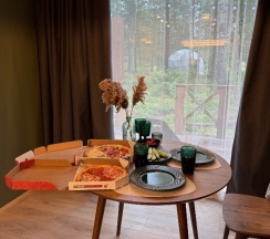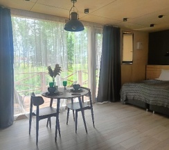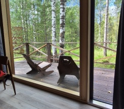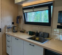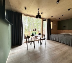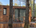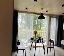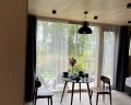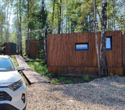 Хорошая локация, снимали два домика, отдыхали двумя компаниями. Всем всё понравилось, домики оснащены умным домом с Алисой. В домиках всё свежее, не обшарпанное в плане ремонта. Панорамное окно в видом на лес.