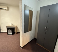 В номере двуспальная кровать, шкаф, стол, стулья, холодильник, сплит-система, телевизор, чайник, кофе, чай, набор посуды, фен, полотенца, средства личной гигиены, тапочки.