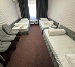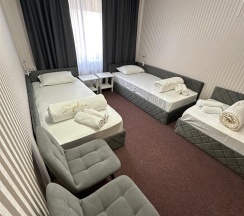 В номере 3 односпальные кровати, шкаф, стол, стулья, холодильник, сплит-система, телевизор, чайник, кофе, чай, набор посуды, фен, полотенца, средства личной гигиены, тапочки.