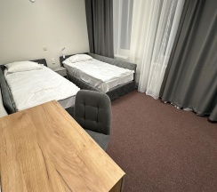 В номере 2 односпальные кровати, шкаф, стол, стулья, холодильник, сплит-система, телевизор, чайник, кофе, чай, набор посуды, фен, полотенца, средства личной гигиены, тапочки.