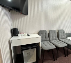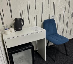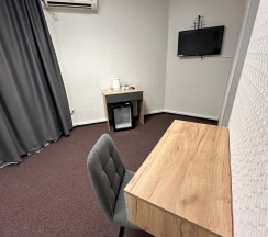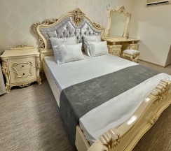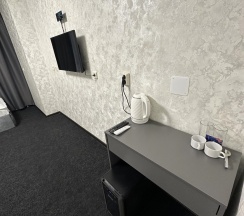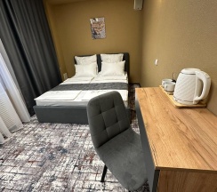 В номере двуспальная кровать, шкаф, стол, туалетный столик, стулья, холодильник, сплит-система, телевизор, чайник, кофе, чай, набор посуды, фен, полотенца, средства личной гигиены, тапочки.