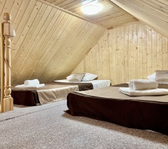 Уютный 2-этажный бревенчатый дом состоит из спального лофта, двух спален и гостиной зоны с раскладным диваном. Ванная комната оснащена душевой кабинкой, косметическими принадлежностями, феном. В распоряжении гостей шкаф, комод, прикроватные тумбочки, телевизор и необходимая мебель для проживания.