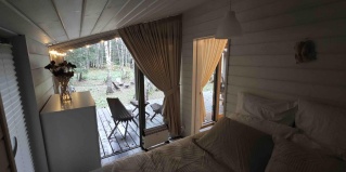 Для размещения гостям предлагаются 4-местные дома, оборудованные всем необходимым дял комфортного проживания. В доме: уютная спальня с удобной кроватью, просторная гостиная с камином и панорамными окнами, мангальная зона укомплектованная дровами, шампурами и решеткой, полностью укомплектованная кухня , солнечная веранда для вечеров с друзьями. Постельное бельё и полотенца включены в стоимость.