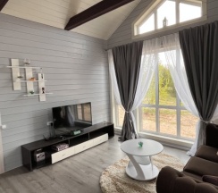 В доме есть всё, что нужно для комфортного отдыха. Красивые панорамные окна в пол, хорошая кухня, где есть всё, что необходимо, удобный большой диван в гостиной с телевизором, удобная кровать в спальне, спальных мест было достаточно, с/у, душ- всё чисто и комфортно )) Пол с подогревом в прихожей.