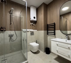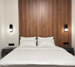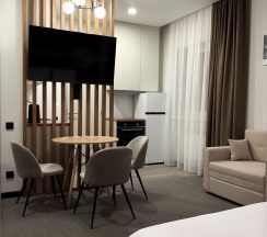 Каждый апартамент оснащен высококачественной удобной мебелью, современной кухней с бытовой техникой, телевизором с Android TV и бесплатным Wi-Fi. Дизайн апартаментов сочетает в себе функциональность и элегантность, создавая приятную и уютную атмосферу для отдыха.