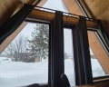 Вокруг тишина, нет толпы людей, из окна видно склоны горы.