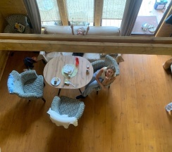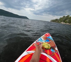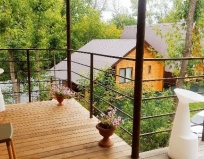 Очень уютная и большая веранда, на которой с утра можно выпить кофе, полюбоваться лесом и высушить сап (кстати там же его можно и помыть шлангом).