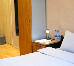 Просторный, комфортный номер для 2х человек с собственной ванной комнатой. В номере: двуспальная кровать (160*200), прикроватные тумбочки, светильники, плоский TV, платяной шкаф. В ванной комнате: душевая кабина, унитаз, косметические принадлежности, тапочки.
