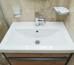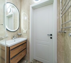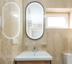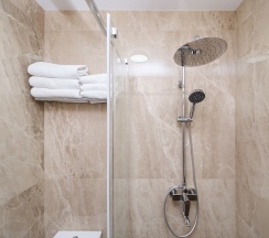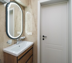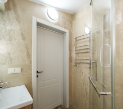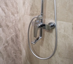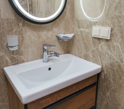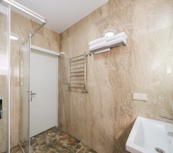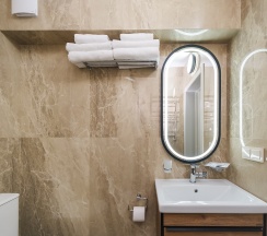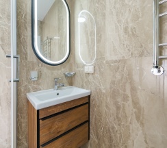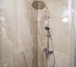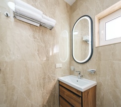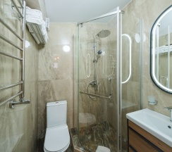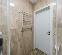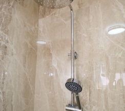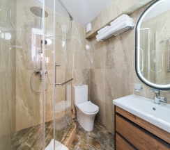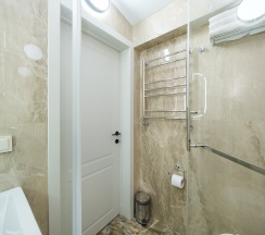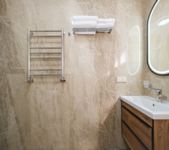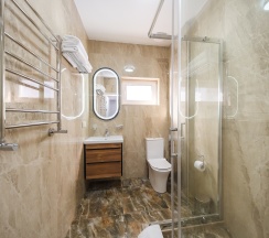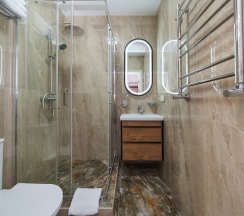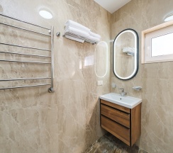 Теплый пол, душевая кабина с тропическим душем, полотенцесушитель, зеркало с подсветкой.
