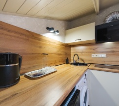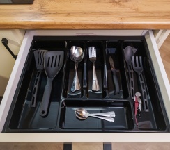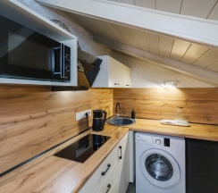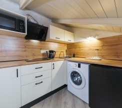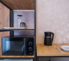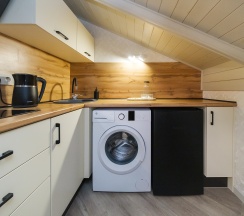 В кухонной зоне-свч печь,стиральная машина,чайник,столовые приборы,вся необходимая посуда,кухонная утварь.