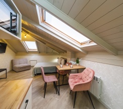 Оснащены мебелью в стиле лофт, удобной кроватью размером king-size и 2 кресло-кроватями.Современный дизайн. Для комфортного пребывания созданы все условия.