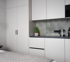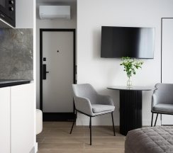 В апартаментах вас ждёт удобная двуспальная кровать (160x200), которая обеспечит отличный сон. Полностью оборудованная кухня с плитой, микроволновкой, кофемашиной, фильтром для воды и холодильником позволит вам готовить любимые блюда без лишних хлопот. Дополнительные удобства включают современную ванную комнату с душем, стиральную машину и телевизор, чтобы сделать ваше пребывание ещё более комфортным.