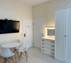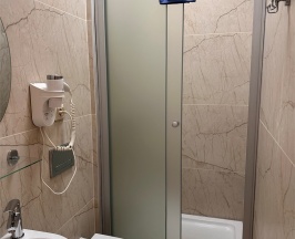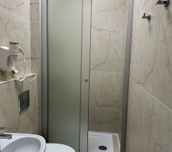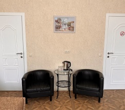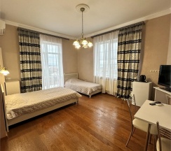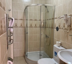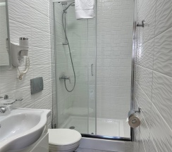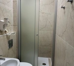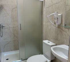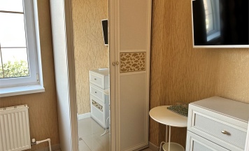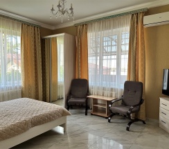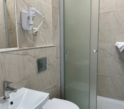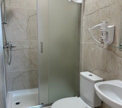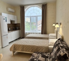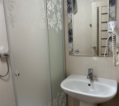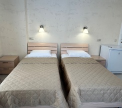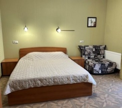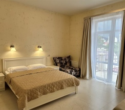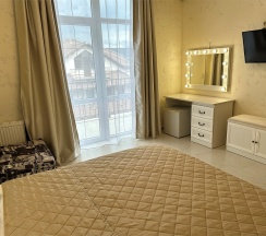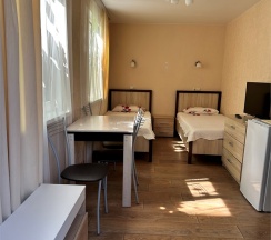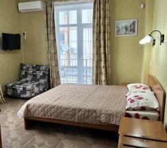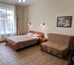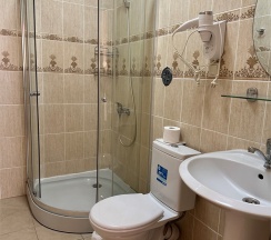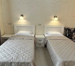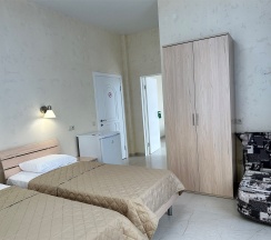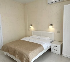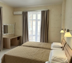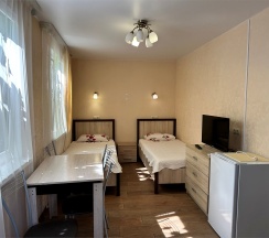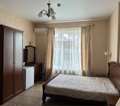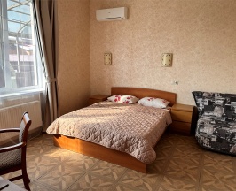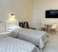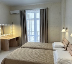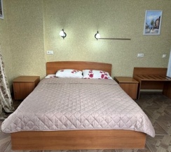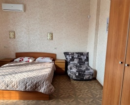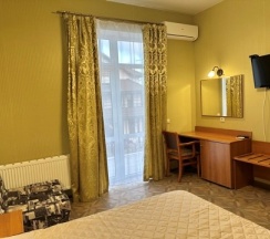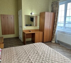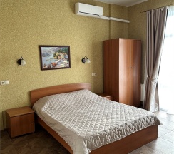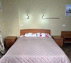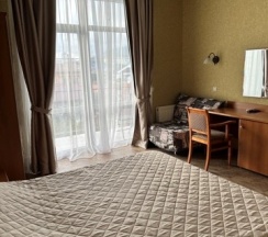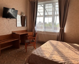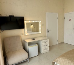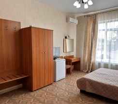 Номер с большой двухспальной кроватью размером 160 и раскладным ортопедическим односпальным креслом размером 90. В номере есть душ,туалет,фен.Цифровое ТВ,бесплатный Wi-Fi Кондиционер .Холодильник-бар .Письменный стол с рабочим креслом. Полотенца .Шкаф для одежды