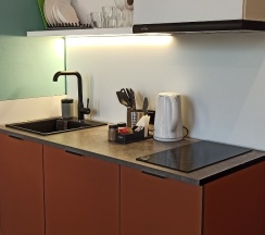 Отель нам очень понравился - современный интерьер с красивым дизайном. Всё необходимое в номере есть! 👍Наш номер был с мини-кухней, это очень удобно! На этаже еще имеется общая кухня. Чисто, уютно, комфортно! Во дворе шикарные ели и маленький фонтан) Спасибо за гостеприимство! 🤗🩵