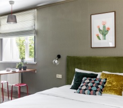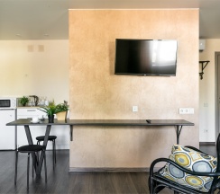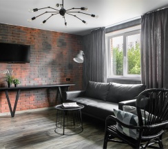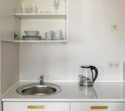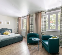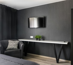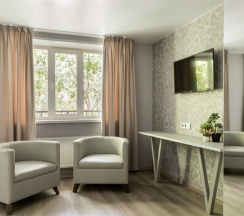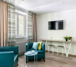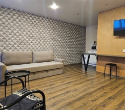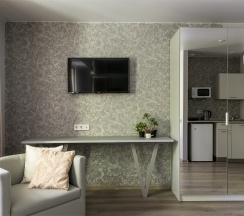 Комфортабельный номер идеально подходит для семейного отдыха и деловых поездок. В номере двуспальная кровать. Гостевая зона с диваном и большим телевизором. Номер оснащен мини-кухней, со всеми необходимыми принадлежностями для приготовления пищи. Собственная ванная комната оборудована душевой кабиной и туалетными принадлежностями. Диван раскладывается в двуспальную зону для сна.