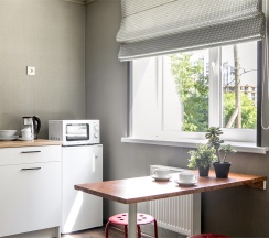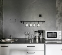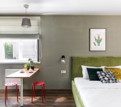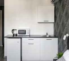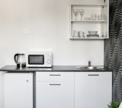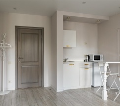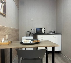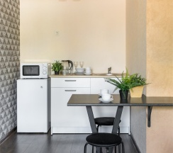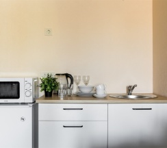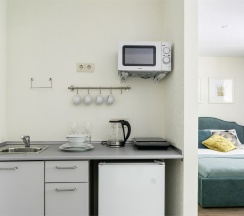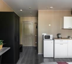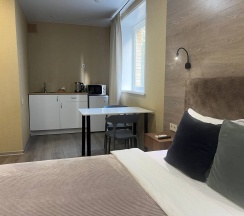 Комфортабельный номер идеально подходит для отдыха и работы. В номере двуспальная кровать, мини-кухня, все необходимое для приготовления пищи, ванная комната с душевой кабиной, принадлежностями. Для удобства гостей предусмотрена рабочая зона с столом и креслами.