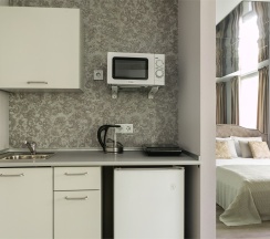 Комфортабельный номер, идеально подходит как для семейного отдыха, так и для деловых поездок. В номере большая двуспальная кровать и гостевая зона с диваном. Номер оснащен мини-кухней, со всеми необходимым для приготовления пищи.