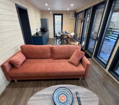 Дизайнерская идея дома «Ретро» заключается в смелом сочетании двух стилей в одном пространстве, что создаёт уникальную атмосферу, где современность встречается с ретро. Элементы советской ностальгии гармонично переплетаются с современными удобствами, создавая неповторимое ощущение домашнего тепла и уюта. Просторная гостиная станет отличным местом как для встреч с друзьями, так и для уютного семейного отдыха. Из Дома «Ретро» открывается роскошный вид на молодые сосны, а рядом с каждым домиком есть мангальная зона.