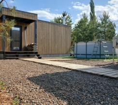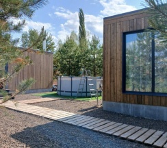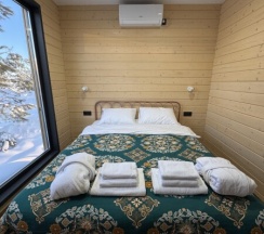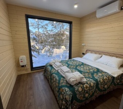 Дом «Восток» воплощает в себе идеальную гармонию традиций востока и современных тенденций дизайна. Каждая деталь интерьера продумана до мелочей, чтобы создать атмосферу уюта и тепла, где каждый гость чувствует себя как дома. Натуральные материалы, такие как дерево придают пространству ощущение близости к природе. Панорамные окна, занимающие большую часть стен, открывают сказочный обзор на окружающий ландшафт, молодые сосны, а рядом с каждым домиком есть отдельная терраса с местом для отдыха, мангальной зоной и сибирским чаном