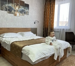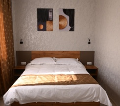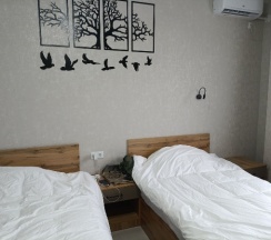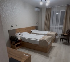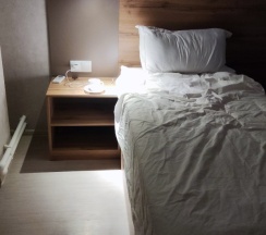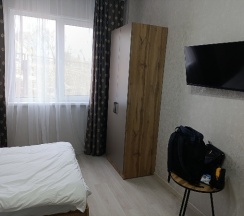 Хороший , новый отель. На входе встречал прекрасный рыжий котик. Номер на троих очень просторный , чистый . Кровать мягкая. Единственный минус - это слышимость .