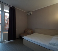Стандартный 3х-местный номер. В номере 2-х спальная кровать (1,6м*2м) и кресло-кровать (0,8м*1.9м). Также есть балкон с мебелью. В номере есть все необходимое для комфортного проживания: с\у с душевой, раковиной и унитазом, сплит-система, мини-холодильник, WI-FI, ТВ на 20 каналов, прикроватная тумба, шкаф, стол, стул, чайник, фен, полотенца, мыльные принадлежности.