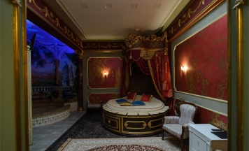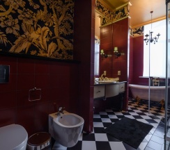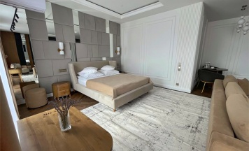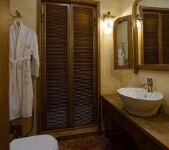 В номере есть большая двуспальная кровать, зона отдыха, вместительная гардеробная с зеркалами и шикарная уборная (ванная, душ, две раковины, туалет, биде).