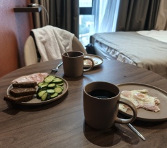 Уютно, чисто. Замечательный номер: большая двухспальная кровать с удобным матрасом, красивый интерьер. Хороший санузел с большой душевой кабиной. Телевизор, вай-фай. Уютная кухня: эл. плита, эл. чайник, микроволновка, холодильник, набор необходимой посуды. Рекомендую! Замечательный персонал, отличное обслуживание.