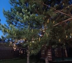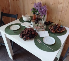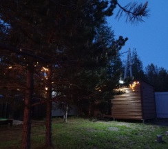 Прекрасное место для отдыха от всех забот. Соглашусь с верхним отзывом - есть абсолютно всё для комфортного проживания (посуда, даже крупы, специи, мангал, шампуры, решётка для барбекю). На террасу можно выставить складные стол и стулья, завтракать там. В домике есть настольные игры. Очень тепло и уютно, если холодно можно включить тёплый пол, обогреватель. На жаркую погоду есть кондиционер. Обязательно посетите баню, стоит того, чтобы отдельно доплатить, веники можно тоже здесь приобрести, как и соляные брикеты. Мы попарились с пихтовым веником, также использовали брикет с пихтой. Такая резкая разница в самом ощущении чистого воздуха, он пропитан запахом сосен везде, поскольку дом среди леса. Птицы там поют круглосуточно, а ночью это придаёт особый шарм.