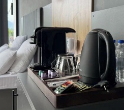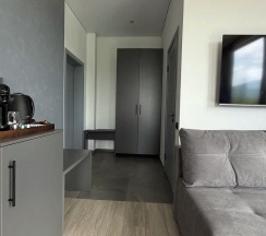 В комнате есть все необходимое для комфортного проживания: кровать king-size, удобный диван с журнальным столиком, телевизор, кондиционер, wi-fi, чайная и кофейная станции, санузел.
