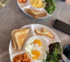 Мы брали проживание с включенным завтраком . Завтрак не разнообразный нужно выбрать глазунья , омлет или скрембл . Далее выбираете рыбка или ветчина , жареный сыр , салат и тост входит в завтрак . Завтрак вкусный ! Большой , с красивой подачей и видом на реку.