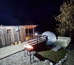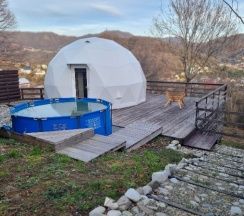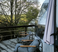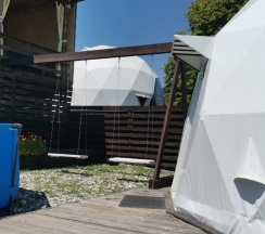 Что немаловажно есть полноценная своя зона вокруг сферы - тут и качельки и терраса и бассейн, можно заказать баньку.