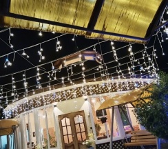 Особенно понравилась территория базы: вечером включают красивую подсветку, деревья и беседки подсвечены гирляндами — очень уютно и по-семейному. Детская площадка, зона с мангалами, кафе — всё ухоженное и продуманное.