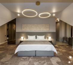 В каждой комнате предусмотрена система климат-контроля, позволяющая создать оптимальный микроклимат. Интерьер выполнен в изысканных тонах с использованием высококачественных материалов, подчеркивающих высокий статус номера. Люкс оснащен современной ванной комнатой с джакузи или душевой кабиной, а также отдельной туалетной комнатой для дополнительного комфорта. Здесь вы найдете все необходимое для незабываемого пребывания.
