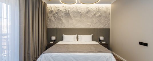 Номера категории "Студия", каждый номер имеет уникальный дизайн, площадь номеров данной категории от 48 м². Эти просторные номера сочетают в себе комфорт и стиль, предлагая уютную зону отдыха и спальную зону. Идеально подходят для тех, кто ищет свободу и индивидуальность в своем пребывании. Насладитесь атмосферой домашнего уюта во время вашего путешествия!