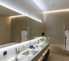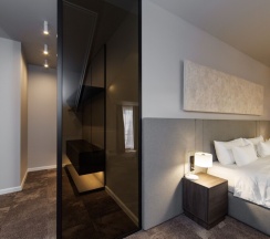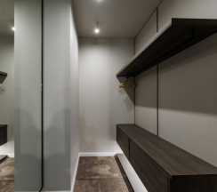 Большая кровать с ортопедическим матрасом и роскошным постельным бельем гарантирует крепкий и здоровый сон. Прикроватные тумбочки с индивидуальным освещением, просторный шкаф для одежды и зеркало в полный рост добавляют удобства и функциональности.