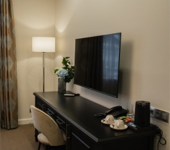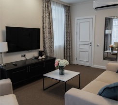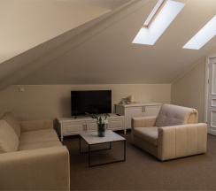 Большой , просторный ,мансардный номер с лаконичным дизайном, сочетающий в себе элегантность классики и функциональность современности. Номер разделён на гостевую и спальню зону. Созданы все условия для длительного проживания.