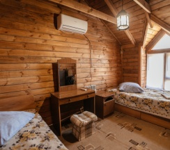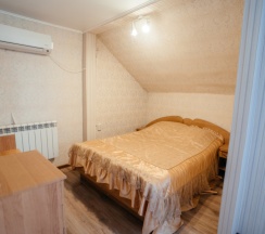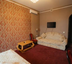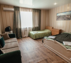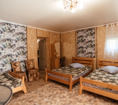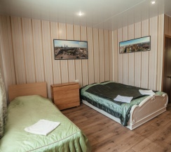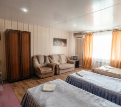 Трехместный просторный номер с одной двуспальной кроватью и двумя односпальными кроватями. В номере индивидуальный санузел, сплит-система. Номер оснащен холодильником, телевизором, чайником.