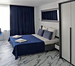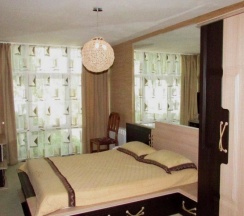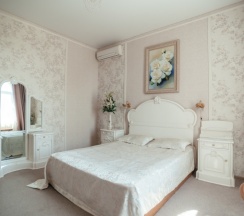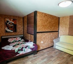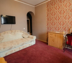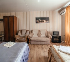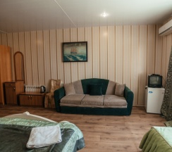 Двухместный просторный номер с одной двуспальной кроватью и раскладным двуспальным диваном. В номере индивидуальный санузел, сплит-система. Номер оснащен холодильником, телевизором, чайником, микроволновой печью.