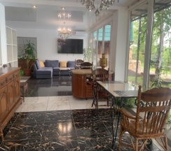 Второй этаж двухэтажного просторного дома. На этаже два двухкомнатных номера и общая лаундж-зона. В каждом двухкомнатном номере: в одной комнате двуспальная кровать и двуспальный диван, во второй комнате односпальная кровать. В каждой комнате индивидуальная сплит-система. На каждый номер индивидуальный санузел. В общем на этаже две двуспальные кровати, две односпальные кровати и два двуспальных дивана. В холле - диван, обеденная зона, микроволновая печь, холодильник, телевизор, чайник. Идеально подходит для большой семьи.