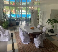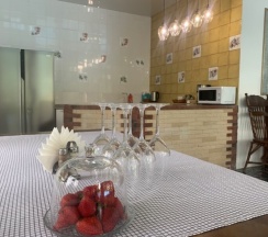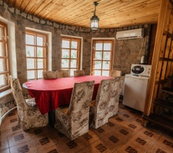 Двухэтажный просторный дом с панорамными окнами на реку и прилегающей беседкой с мангалом. В доме на первом этаже расположена столовая, кухня, огромный зал для проведения мероприятий, общий санузел и одна спальная комната. На втором этаже три спальные комнаты с балконом с шикарным видом на реку. В доме всего четыре спальных комнаты. В каждой комнате двуспальная кровать с ортопедическим матрасом, двуспальный раскладной диван, санузел, сплит-система, телевизор. Кухня оснащена всем необходимым: электрическая плита, чайник, микроволновка, кофеварка, посуда, большой холодильник. Также в зале огромный телевизор и диван, где можно приятно провести время в кругу семьи или в большой компании.