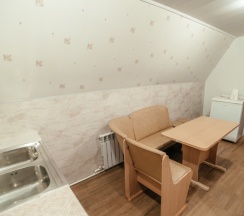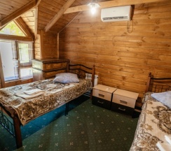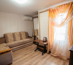 Четырехместный двухкомнатный просторный номер на втором этаже. В номере мини-кухня с холодильником, раковиной и чайником. В одной комнате - две односпальные кровати, во второй комнате - две полутороспальные кровати и полутороспальный диван. Каждая из комнат оснащена сплит-системой. В номере индивидуальный санузел, телевизор.