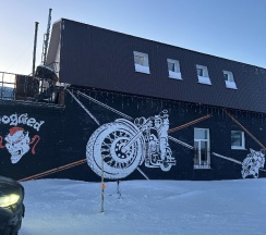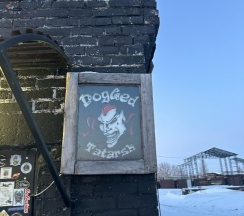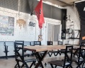 Камин, деревянный стол, бар стойка, фортепиано, гитара и флаг, эмблемы Ок, дизайнеры постарались, и воздух чистый