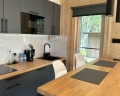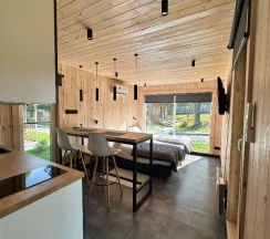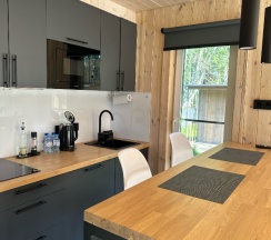 Приятное тихое место. Дом новый, чистый с удобной планировкой (в маленьком доме есть все для двоих: кровать, полноценная кухня, барная стойка и шкаф). Очень клиентоориентированные администраторы.