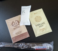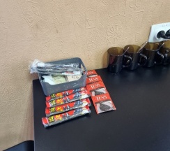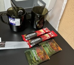 Приятно удивили наличие средств гигиены: щётка, паста, шампунь, гель, тапочки. Плюсом идёт кофе и чай.