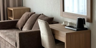 Комплектация комнаты: 1 двуспальная кровать или 2 раздельные кровати; двуспальный диван; рабочая консоль; ж/к телевизор; кондиционер; холодильник; шкаф; тумбочка; чайник с набором для чая; wi-fi; санузел; душевая кабина; фен; гигиенический набор; полотенца; халат; тапочки.