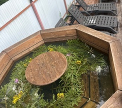 Воздух потрясающий. Всего 4 домика. Около каждого своя лужайка. Около первого домика есть костровая чаша с шезлонгами-креслами вокруг. Есть баня, около бани чан. Вода нагревается костром под этим чаном. Вода меняется под каждый заказ. Везде чистота и порядок.